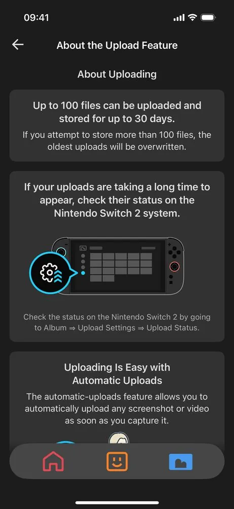 应用还透露,Switch 2 将支持自动上传功能,主机上截图或录屏的内容可以自动同步至手机应用,无需用户手动操作。