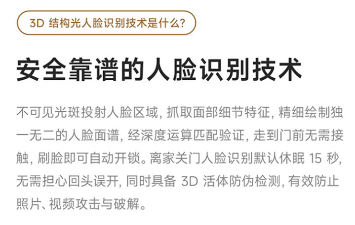 据史先生称,门解锁那会儿,他人正躺在床上刷题,还是通过门锁开启后推送的消息,才发现不对劲的。他买的门锁型号是小米智能门锁2 Pro,这款门锁是自带AI 3D结构光人脸识别的,并且拥有AI智能猫眼,史先生回看智能猫眼拍摄的视频后,发现这位骑手的脸型长得确实和自己有点像,这或许是门锁解锁的原因。